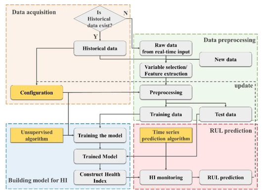 The proposed methodology can be applied immediately regardless of whether run-to-failure data are less or not exists in the first place. The proposed framework is composed of the following three technical processes: Acquisition and preprocessing of data, building model for HI construction and RUL prediction. The proposed framework is shown in Figure 2.