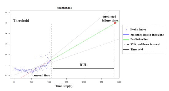 As mentioned in Section 2, when aging or abnormality occurs in the equipment, the trend of the HI may arise. Then, it is possible to predict the future value of the HI using time series prediction algorithms. When an incident ends, the configuration can be updated based on the failure data. In this way, the more the proposed framework is applied, as knowledge of failure data is accumulated, the performance can be improved [28]. In this paper, simple linear regression is used. Similarly, RUL can be calculated using regression. The RUL is the difference between the current time (index) and the predicted failure time where the regression prediction line meets the threshold. In addition, regression has the advantage of providing more accurate predictions because it can give confidence intervals for future time points. This is illustrated in Figure 3.