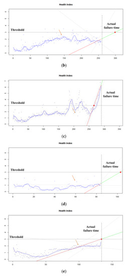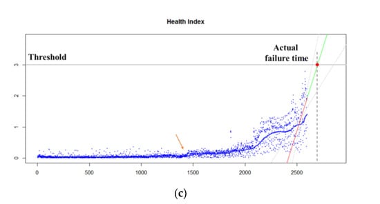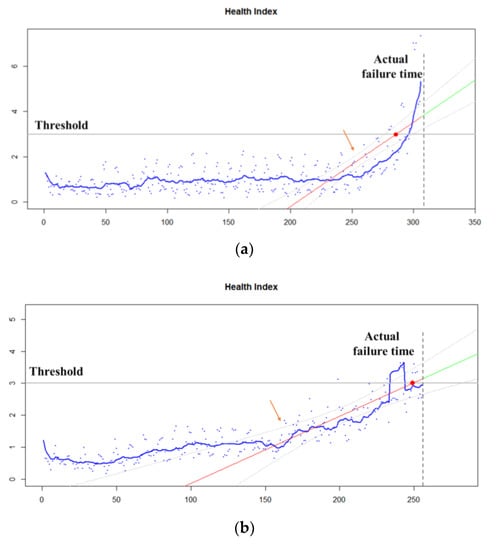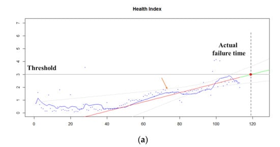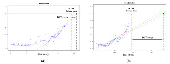 In this case, the number of samples for fitting the regression line is important. This is because in general, the closer the failure point, the more spurred abruptly the HI changes. Figure 4 compares the results of the last 50 samples with the total sample. Fitting to the full sample makes it difficult to predict the exact RUL even if the failure is imminent while fitting to the latest sample can predict a more accurate RUL.