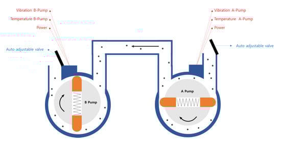 The data is generated from the pump equipment and consists of pressure, temperature, vibration, power. One pump is composed of a A-pump and B-pump and the example of the overall structure is in Figure 5.
