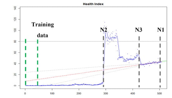 In this paper, the slope represents the trend of the HI. For example, if the health of the equipment is good, then there is no trend in the HI, the slope of the regression model can be either very small or negative. On the contrary, when an abnormality or aging occurs in the equipment, the trend of the HI may rise, and the slope value of the regression model becomes large.