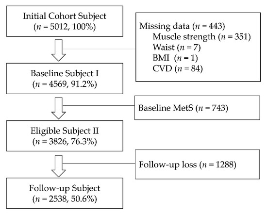 For the present study, 1186 out of 5012 participants were excluded at baseline (HGS and BMS (N = 351), body mass index (BMI; N = 1), WC (N = 7), cardiovascular disease (CVD; N = 82), and MetS (N = 743)). During the 16-year study period, 1288 out of 3826 participants were lost to follow-up due to a lack of participation. Finally, 2538 participants remained eligible for this investigation (Figure 1). The follow-up rate at the ninth examination was 50.6%. This study protocol was conducted according to the guidelines of the Declaration of Helsinki and approved by Institutional Review Board of the Korea University Ansan Hospital, and written informed consent was obtained from all study participants.