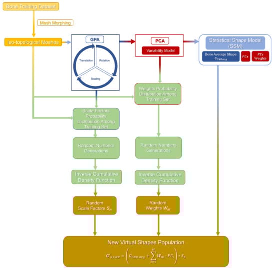 In this formulation, the average shape provides the mean anatomical information of the considered geometry (bones in the present case); the average shape can be obtained from all geometries belonging to the training set once they have all been scaled to be the same size, centred (i.e., their centres of mass are coincident) and aligned. The PCs represent the main (i.e., the most variable) directions of deviation from the average shape highlighted by the analyzed cohort. The linear combination of these PCs through properly computed weights generates a new shape, belonging to the same “family”, i.e., to the same statistical shape distribution.