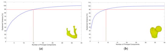 Cumulative explained variance versus the number of principal components for the mandible (a) and for the proximal femur (b).