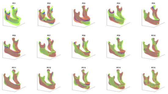 The first 15 mandible principal components (PCs). The average mandible shape is represented in blue, while the deformations along the ith PC applying a weight equal to are reported in green/brown.
