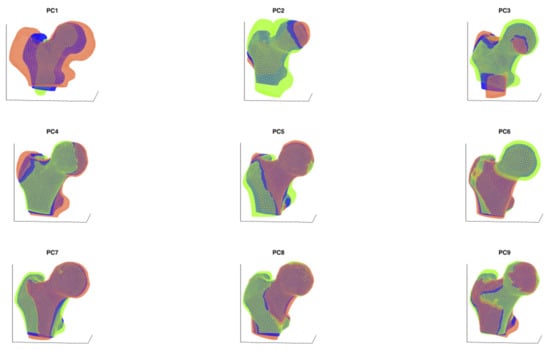 The first nine proximal femurs principal components (PCs). The average femur shape is represented in blue, while the deformations along the ith PC applying a weight equal to are reported in green/brown.