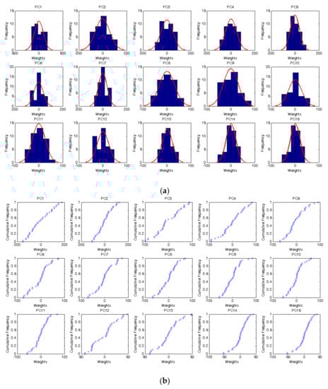 Following the definition of the SSM (Equation (6)), each ith PC contributes to determine the geometry of each bone sample with a certain weight Wi. Hence, the frequency distributions of these weights among the whole analyzed cohort can be considered. Figure 5a shows them with reference to the mandible’s dataset. It is evident that the normality of distributions is quite questionable. For this reason, the authors chose to develop a stochastic model based on empirical cumulative frequency distributions (Figure 5b).