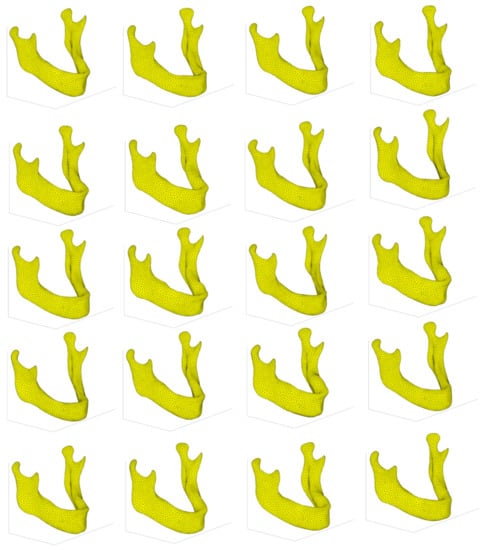 New sets of 20 bones, the size having been defined arbitrarily for example purposes, could therefore be generated applying inverse transform sampling for both the mandible and the proximal femur changing the PCs weights; the results are reported in Figure 6 and Figure 7.