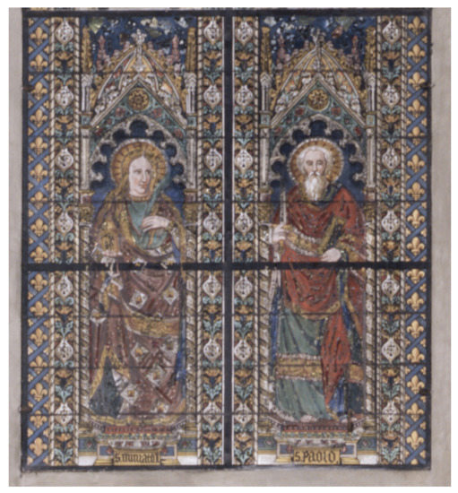 Image of a part of a two-lancet stained window in the Florence Cathedral, representing San Miniato (St Minias) on the left and San Paolo (St Paul) on the right. The artwork was made in 1395 by Antonio da Pisa and is recorded in the Italian Stained Glass Windows Database (BIVI). Reproduced with permission of Opera di Santa Maria del Fiore, Firenze.