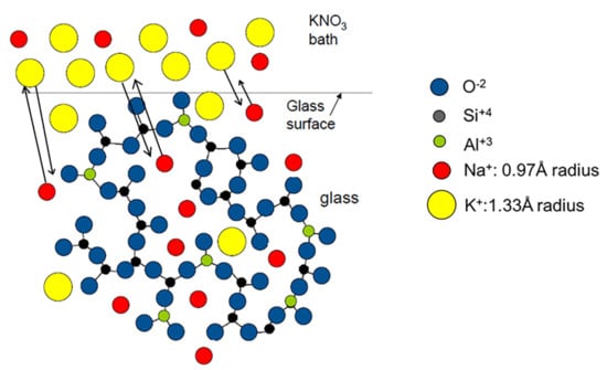 Depiction of the K/Na ion-exchange process using KNO molten salt as the source of K ions. The glass considered here is an aluminosilicate glass with an alkali oxide (NaO) as glass modifier. The kinetics of the process is described by diffusion equations. Reproduced from [24] with permission by John Wiley and Sons.
