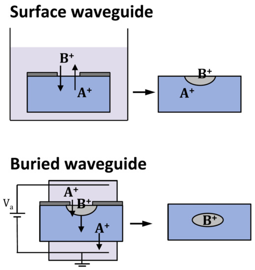 Outline of two different ion-exchange processes involving two ions A and B (e.g., K and Na, respectively): the upper drawing refers to a purely thermal diffusion, that produces a surface waveguide. The bottom drawing indicates a field-assisted diffusion, that leads to a buried waveguide. Reproduced with modifications from [25] with permission by Elsevier.