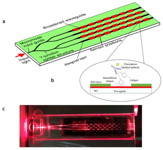 (a) Integrated optical sensor’s layout; (b) cross-sectional view, showing waveguide, isolation layer and location of the surface chemistry; (c) photo of light propagation along the waveguide chip (Photo credit: Lanhua Liu). Reproduced from [31] under a Creative Commons CCL4.