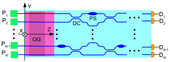 In Figure 6, the design is shown of an integrated optical device of arbitrary dimension N, that is, N optical paths (channel waveguides) coupled by concatenated directional couplers (DC) and phase shifters (PS). It represents a generic optical device able to implement different passive quantum operations. Active functions, such as optical generation and amplification, may also be added if hybrid glasses, with a portion doped by rare earth elements (on the left in Figure 6), are used.