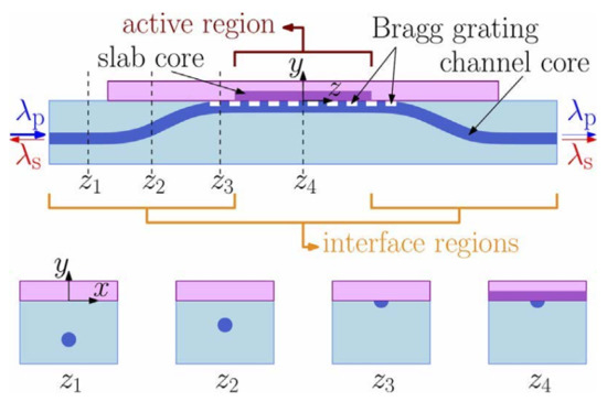 An example of a laser device is shown in Figure 7: it is a 3D hybrid structure, with a channel core waveguide and a slab core waveguide which, in a certain volume, interact with each other and with the Bragg grating that provides the optical feedback necessary for laser action. Figure 8 shows the longitudinal and cross sections of the device. The passive glass is a GO14 silicate by Teem Photonics, whereas the active glass is a IOG-1 phosphate by Schott, doped with 2.2 wt% ErO and 3.6 wt% YbO. In both glasses, the waveguides are produced by Ag-Na ion exchange.