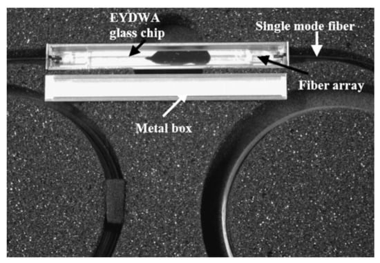 Photo of a packaged EYDWA device. Standard single mode fibers are pigtailed to both the input and output ends of the channel waveguide. The glass chip is then mounted to a metal box to provide mechanical stability and easy handling. Reproduced from [155] with permission by Elsevier.