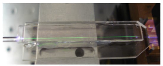 Among the various research lines aiming at improving the characteristics of waveguide optical amplifiers, it is worth mentioning the article by Donzella et al. [160], where another 3D hybrid structure is designed with the goal of making possible the use of a low-cost high-power broad area laser diode, instead of an expensive single-mode 980 nm laser, for the amplifier’s pumping. Their design, sketched in Figure 10 includes direct butt-coupling of the pump light into a multimode passive waveguide (in silicate glass): an Er-Yb doped single mode waveguide (in phosphate glass) is placed on top of the passive one, and light is progressively coupled from bottom to top waveguide, being captured by Yb ions acting as sensitizers for Er ions. Experimental tests with ion-exchanged waveguides fabricated in the two glasses allowed to measure amplified spontaneous emission (ASE); Figure 11 shows the upconversion green light in the upper single mode waveguide, a proof of the effectiveness of the pumping scheme. According to their numerical simulation, gain values of over 3 dB/cm should be achievable.