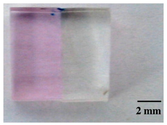 Photograph of the bonded glass sample, with the active (pink) and passive (transparent) parts. Reproduced from [179] with permission by Elsevier.