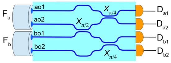 For example, if a weak coherent state is excited in channel waveguide 1 with pumping beam P, then it is obtained . Next, the concatenated couplers and along with the shifter (see Figure 13) perform a linear transformation, therefore, by taking into account Equation (5) for and and Equation (7) for , the following output state is obtained