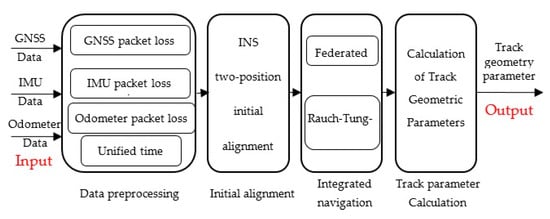 The detection of track geometry parameters is essential for the safety of high-speed railway operation. To improve the accuracy and efficiency of the state detector of track geometry parameters, in this study we propose an inertial GNSS odometer integrated navigation system based on the federated Kalman, and a corresponding inertial track measurement system was also developed. This paper systematically introduces the construction process for the Kalman filter and data smoothing algorithm based on forward filtering and reverse smoothing. The engineering results show that the measurement accuracy of the track geometry parameters was better than 0.2 mm, and the detection speed was about 3 km/h. Thus, compared with the traditional Kalman filter method, the proposed design improved the measurement accuracy and met the requirements for the detection of geometric parameters of high-speed railway tracks.