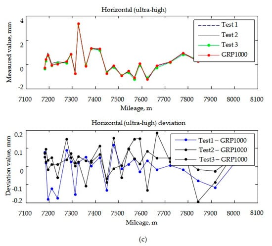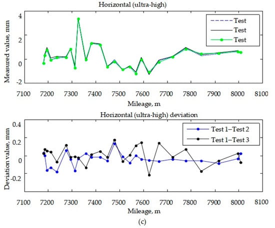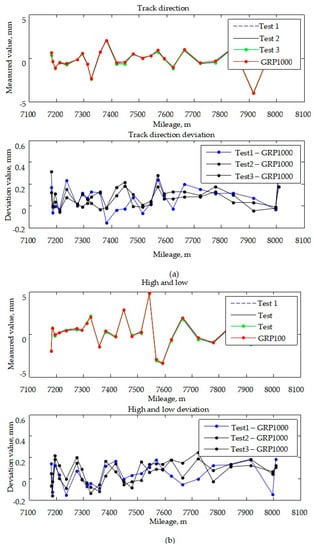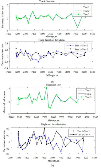 Railway track irregularities are caused by vehicle dynamics and natural degradation. Changes in track geometric parameters directly affect the operational safety of trains and are the main factors affecting determining the speed and smoothness of the train [1,2]. The geometric parameters of a track comprise seven internal track parameters—track gauge, track direction, and high and low, horizontal (ultra-high), versine, warp, and track gauge change rate—and two external track geometry parameters—lateral and vertical deviations from the track midline to the left and right of the track relative to the design line position [3].