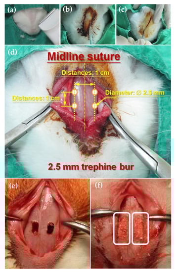 Each NZW rabbit was assigned bilateral maxillary sinuses under sterile surgical condition (Figure 1). The skin at nasal dorsum area was shaved (Figure 1a), disinfected, and local anesthesia (0.5 ml of lidocaine with 1:100.000 epinephrine) was injected in the middle of this area (Figure 1b). A 2.5–3.0 cm vertical periosteal incision was performed at midline nasal dorsum (Figure 1c) and the periosteum was deviated laterally to disclose the nasal bone. A bilateral rectangular window was carried out by made two circular windows vertically (the distance of each window is 1 cm) using a 2.5 mm diameter trephine bur, located approximately 0.5 cm laterally to the midline nasal bone (Figure 1d), and each circular window then connected to shape rectangular window (Figure 1e). Hereafter, the investigated α-CSH/PRP (0.3 g) and α-CSH (0.3 g) samples were randomly implanted in the rectangular window. Finally, the skin and periosteum were returned and sutured to the original position.