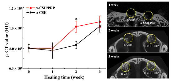 Figure 2 displays the BMD in the sinuses obtained from the HU value, which was measured by µ-CT scanning. Based on the HU value obtained from the sinuses implanted by α-CSH and α-CSH/PRP, the sinuses treated with α-CSH/PRP showed a continuously increasing HU value during the observation time. Moreover, the α-CSH/PRP group experienced a significant 21% increase in HU value than the control group at the second week after implantation. The increase in HU value in the sinus group grafted with α-CSH/PRP was supported by the healing of the sinus wound over time during the observation period as shown in Figure 3.