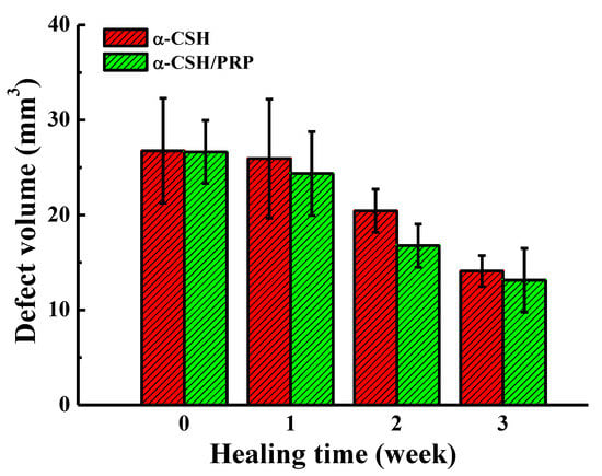 Defect volume of the sinuses at 0, 1, 2, and 3 weeks after treated with α-CSH and α-CSH/PRP bone graft.