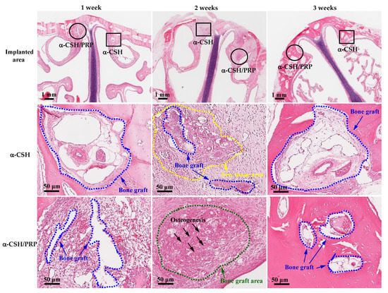 H&E staining results of the α-CSH and α-CSH/PRP at 1, 2, and 3 weeks after implantation. (The higher magnification images were taken from the investigated samples in each time point marked as black circular and rectangular areas, respectively).