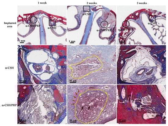 Masson trichrome staining results of α-CSH and α-CSH/PRP at 1, 2, and 3 weeks after implantation. (The higher magnification images were taken from the investigated samples in each time point marked as black circular and rectangular areas, respectively).