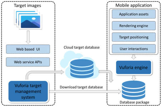 The complete architecture of the Vuforia software development kit. This Vuforia platform consists of a Vuforia engine and a web-based Vuforia target management system where the target images are uploaded. The cloud target databases are accessed directly using web services, while the device-based database is downloaded from the developer portal.