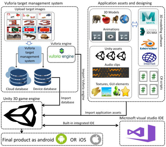 We design and develop our applications using the popular game engine Unity 3D. Unity is a game engine that provides different functionalities for designing and developing user interactive virtual 3D environments. It also supports application development across multiple platforms. The Vuforia AR SDK’s free support makes the development of the AR-based applications straightforward in the Unity 3D game engine [59]. The visualization of the 3D graphics in Unity 3D is highly improved as well. Unity 3D supports different 3D model formats that make designing more manageable and attractive [60]. Therefore, the augmentation of these 3D virtual content into the physical world makes AR techniques more realistic and precise. Further, Unity 3D improves the communication between the game objects and the programming section that helps the developer in the logic implementation more quickly and accurately.