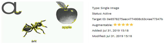 We create the target databases with the Vuforia Target Management System (VTMS) in the first phase of the development. The image targets of the AR applications are uploaded to the web-based VTMS at the Vuforia developmental portal. The feature points in these image targets are detected by the VTMS and are used to recognize these target images in the real environment. VTMS assigns a rating to each target image-based on the feature points, as shown in Figure 3. These target images can be accessed from both the cloud and local device-based datasets. We use device-based target databases downloaded from the Vuforia development portal and add to the Unity 3D environment. For designing the 3D models and animations, we use Unity 3D free assets and 3D designing software, such as Autodesk Maya, 3D Max, Blender, and other free internet resources. For logic development, we use C# programming language using Visual Studio. All the AR application’s design and developmental content are integrated within Unity 3D.