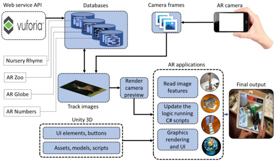 Different types of AR Software Development Kits (SDKs) are mentioned in the literature that has been used for the development of educational applications [57]. We use the Vuforia SDK, due to its extensive usage in the development of AR learning applications. Vuforia is an AR SDK that can track target images, objects, and ground surfaces with computer vision techniques. Using it, a 3D virtual environment can be augmented into the real world surface. The target’s position and direction are tracked with the help of an AR camera (mobile, webcam), and then the virtual 3D objects are rendered on the surface of the target. The virtual content is user interactive in real-time, and it seems the same as the part of real world physical life. Figure 1 shows the complete architecture of the Vuforia SDK [58].