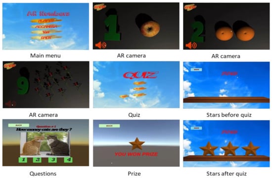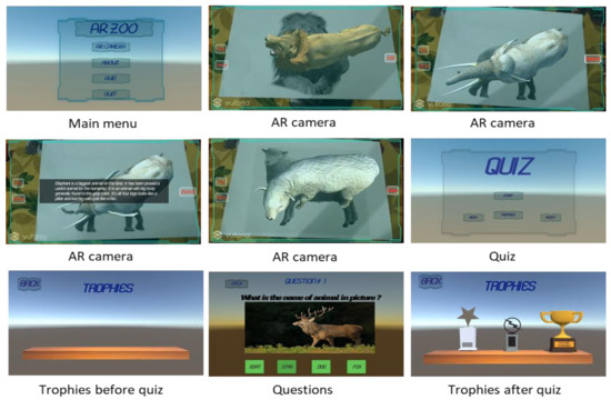 This application is designed for both learning and testing purposes. In the first AR scene, students perform a learning activity of numbers with the help of AR content. In the second scene, students perform a quiz to test their learning level. This quiz comprises a counting activity in which students have to count the number of animals and objects in given images. Students get the reward in the form of trophies displayed in the application’s trophy room. Different screenshots from the AR Numbers application are shown in Figure 6.