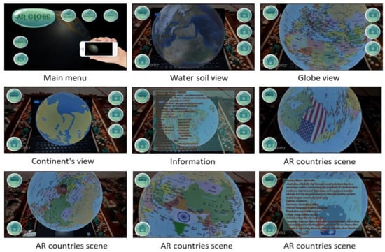 The AR Globe application is designed for understanding the physical globe. Its different views are water/soil view, continent division, and globe view. In the water/soil view, the surface of the earth is shown with the percentage of water and land covering the earth’s surface that is also known as the satellite view of the earth. This application is enriched with AR technology that is far different from the traditional globe. This application aims to introduce a unique augmented environment where learners can observe different views of the earth’s surface with the help of 3D interactive models. Students can also learn about different countries of the world and find their location on the surface of the globe. Students can learn about the physical location of countries on the globe. As this application uses marker-based AR, we define different countries’ flags as target images for visualizing a unique virtual 3D globe. These image targets can be downloaded from the link given in the application. This application has two AR session scenes. In the AR Globe scene, the earth’s surface is studied and observed with 3D virtual interactive globes. Different countries and their boundaries, locations, areas, and all other information are presented in the second scene. Students can view the country area covered with the flag for the corresponding targeted flag. Students can interact with these 3D models of the globe, and they can rotate, scale, and translate in the scene view to observe from a different angle of view. There is also textual information for learning purposes. Scenes from “AR Globe” are shown in Figure 8.