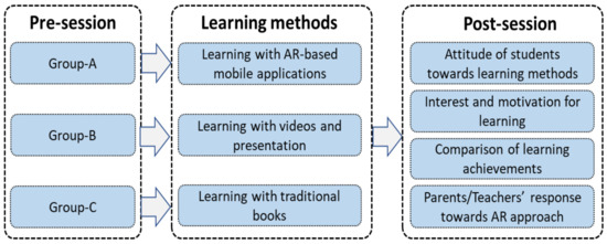 Each group is assigned to a teacher and performed a learning activity with a different method of teaching. In Group-A, the students perform the learning with the help of our designed AR applications. A tablet is provided to each student of the group along with image targets and is guided by the teacher about the application. Similarly, the participants of Group-B performed the learning session of the same syllabus by watching videos and presentations. In Group-C, the learning activity is performed with the help of the traditional book-based method. The experimental procedure of the study is shown in Figure 9.