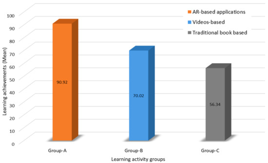 We show that AR-based learning methods are more helpful to the students to improve their learning skills and knowledge gain. Participants of Group-A ranked first in learning achievements (M = 90.92 and SD = 6.09), the Group-B candidates ranked at the second position (M = 70.02 and SD = 7.92). Students in Group-C show lower learning achievements in PEQs (M = 56.34 and SD = 10.62). Figure 10 shows the comparative graph of the learning achievements of the students in PEQs conducted in different learning activities.