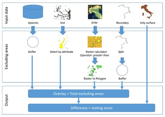 Honey bee mating is difficult to control as it occurs in flight, several kilometers away from the hive of origin of both queens and drones. In recent years, there has been an increase in the introduction into Italy of queen bees and swarms originating from interracial crossings (especially those known as “Buckfast”), or belonging to non-native subspecies. Consequently, there is a strong need to establish areas suitable for controlled mating. The Italian national beekeeping registry (BDNA) has been recently set up to monitor the position of apiaries and movement of hives, with the purpose of economic and sanitary protection and improvement of bee heritage and food safety. The BDNA was, thus, deemed a suitable tool to explore the availability of areas that could be used as mating stations. Specific criteria, such as not be classified as wetlands, altitude below 1500 m a.s.l., distance of at least 6000 m from an apiary, and distance of at least 1500 m from the national terrestrial border, were selected for defining the mating stations. Furthermore, all the remaining Italian national territory was considered suitable for settlement of mating stations, including towns, industrial settlements, and roads. Based on these criteria, the following methodological framework was applied: (1) collection of the required data (i.e., apiaries coordinates, geospatial data on soil classification, geospatial data on terrain altitude, Italian boundary geospatial data); (2) calculation for the excluded areas according with the criteria listed above; (3) calculation of the mating areas by means of the difference between the entire Italian territory and the excluded areas. The database of BDNA was used to identify them. Appropriate databases and software were used to exclude the areas of the Italian national territory that did not fulfill the established criteria. In this paper, we report the procedure applied to identify on maps the areas suitable for controlled mating of queen bees in the Italian national territory based on data currently available in the BDNA.