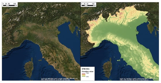 These maps are print screens obtained from the Italian geoportal (http://www.pcn.minambiente.it/viewer/index.php?services=dtm_20m, accessed on 31 May 2021). The left image is the representation of the territory derived from satellite data, where it is visually possible to recognize the territory’s orography. The right image is the DTM image of the same portion of territory. The image is in reality geospatial data composed of pixels whose values represent the altitude. A chromatic scale, which range from green to brown, is used to represent the altitude variation.