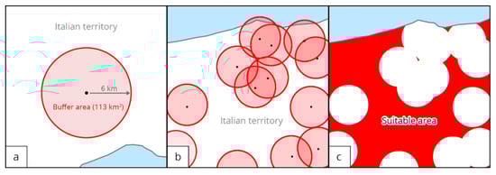 To exclude the areas that are within the distance of 6000 m from any apiary, the buffer tool was applied. “Buffer” is one of the most important geoprocessing operations and frequently used in GIS projects []. A buffer increases a feature’s area by a given radius, exactly following its original geometry (point, line, or polygon). For the calculation of the areas to exclude, BDNA data were used, and in particular all the apiaries as of December 2019. A total of 143,738 apiaries were extracted and used to calculate the buffer areas (Figure 3a). The set of all calculated buffers (Figure 3b) was then used to exclude these portions of territory from the national surface (due to the presence of apiaries within 6000 m radius).