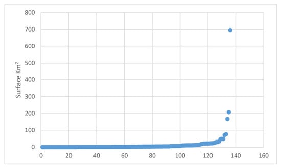 A total of 136 areas were identified (6 small areas with a surface value less than 0.09 hectares have been excluded from the analysis) as suitable areas for establishment of mating stations, summing up to a total of 1977.59 km2, corresponding to approximately 0.65% of the Italian national surface. The surface of the identified areas ranges from 0.0014 km2 up to 696.16 km2. In Figure 4, the density distribution of the mating areas surface is presented. The distribution shows a strong asymmetry due to the presence of many small values. In particular, the distribution showed a median value of 1.3 km2 and the last 25th percentile has a value of 4 km2.