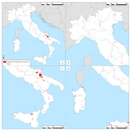 (a) Comprehensive distribution and location of the possible suitable areas for establishment of mating stations in the Italian territory; (b) detail of central-north Italy; (c) detail of central-south Italy; and (d) detail of Sardinia region. Red areas are those suitable for potentially establishing mating stations. The Italian territory is shown with borders among regions.