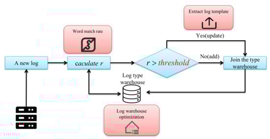 This section introduces the proposed log pattern extraction algorithm and related optimal. As described in the introduction, the main focus of log pattern extraction is the unstructured part of the log. Therefore, unless otherwise specified, a log described later refers to the content of the unstructured part of the log (for example, the last field: Invalid user UserName from 0.0.0.0 of the example log in the introduction part). The log pattern extraction algorithm is generally divided into online methods and offline methods. Offline methods usually require historical log data, and then cluster the historical logs through a round of traversal, after that it can extract a template for each type of log. Although this method is intuitive, it cannot form a new category in real-time if a new log does not meet the known category in actual applications. Therefore, the online log classification method is more valuable in the actual application. In general, the flow of the online log classification algorithm is shown in Figure 1.