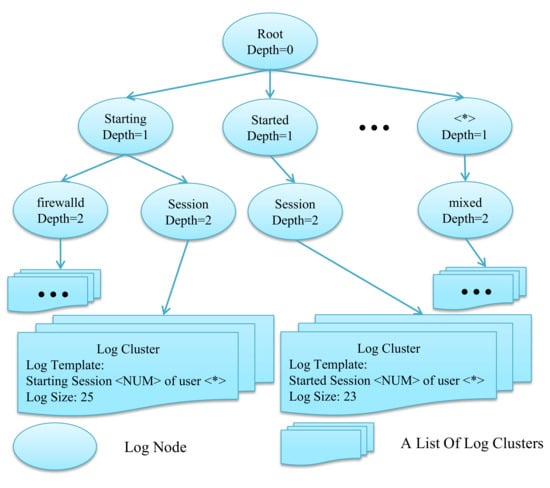 The depth of the log warehouse tree structure constructed in Figure 2 is two. Because the leaf node stores a list of log clusters in practice, which is different from the structure of other nodes in the tree, so it does not add the value of the parameter “depth” in the program. Specifically, all of the branch nodes that construct the tree structure contain a depth parameter and a word. In particular, the depth of the root node is 0, the word “Root” is used to represent the root node, and the other branch nodes store the words that represent the actual log. Same as the method Drain in the paper, if a number appears in a word or the number of nodes in this layer exceeds a predefined value of the parameter “max_children”, the log template will be uniformly located at a special node “<∗>” in the current layer. The leaf node of the log warehouse tree structure stores a list, each element is represents a log cluster structure. The structure contains a log template representing the log cluster and a size variable to save the corresponding log number which is the occurrences of the log type.