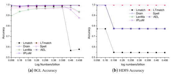 First, the comparison between the optimization method we proposed and the original method is analyzed. It can be seen from Figure 4 that the initial results of Lmatch are better on HDFS and GBL data, but after a certain amount of logging, the accuracy of the results begins to decrease significantly, which shows that directly using the word matching rate algorithm based on the longest common subsequence has no obvious advantage in parsing log patterns. The accuracy of LTmatch has remained stable when the log capacity changes, indicating that the improved log pattern extraction algorithm has more strong generalization ability than the algorithm before the improvement.