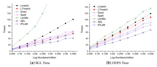In order to analyze the efficiency of the algorithm, this article uses the same dataset as the previous section and uses the same method to classify patterns and record the time on the logs that are split into the same scale. The final experimental results are shown in Figure 5. It should be noted that in order to make the result clearer, the maximum time period is set to 145 s in Figure 5a, so the LenMa algorithm is not fully displayed, but the trend of increasing time is already obvious.