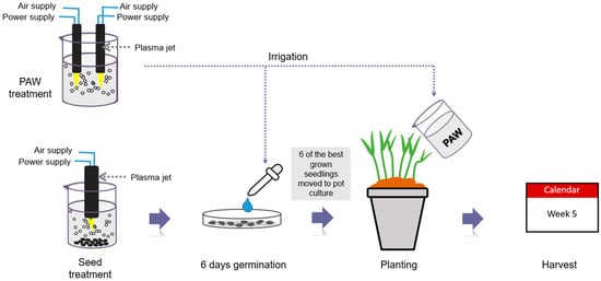 Plasma-treated water or plasma-activated water (PAW) is produced by applying plasma to water in order to generate active oxygen molecules and excited OH radicals. Atomic oxygen and nitrogen generated in gaseous plasma could transfer into liquid and be easily converted into other reactive oxygen species (ROS) and reactive nitrogen species (RNS), such as nitrates (NO3−), nitrites (NO2−), and hydrogen peroxides (H2O2) in the solution. Air is considered to be the most abundant processing gas at low cost, and acts as a great source of oxygen (O2) and nitrogen (N2) with ultraviolet radiation and other chemical species in liquids. PAW is a mixture of high biochemically reactive solution of an acidic condition due to the changes in oxidation-reduction potential (ORP), electrical conductivity (EC), and the formation of RON and RNS [13,14]. Judée et al. evaluated the potential application of plasma treatment of tap-water (PATW) produced by cold atmospheric pressure DBD for improving agricultural quality [15]. The study revealed that the formation of nitrite, nitrate, ammonium ions (NH4+), and H2O2 in the water could induce and enhance crop growth, and that the consumption of bicarbonate ions could promote seedling growth. The length of the seedlings increased by 34% and 128.4% after 3 and 6 days of PATW treatment. The production of reactive species using plasma-activated water could change or affect the seeds both physically and chemically. Thirumdas et al. reviewed the relevant research on PAW and indicated that the physical and chemical properties of PAW are related to the acidity, conductivity, redox potential, and concentration of ROS and RNS in the water, which affects microorganisms [14,16]. In addition, Thirumdas et al. suggested that PAW has a synergistic effect on food disinfection and can also promote the growth of seed seedlings [14]. The increment in the proportion of nitrate and nitrite ions in PAW may be the actual reason for the improvement in plant growth. Soaking seeds in PAW can play an antibacterial role and can also promote seed germination and plant growth. PAW may be used to increase crop yields and confront drought environmental conditions [12,14].