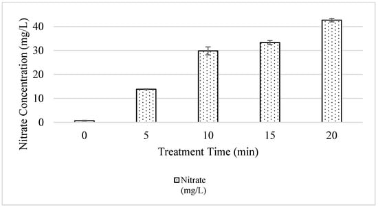 Concentration of nitrates (NO3−) produced in PAW under different treatment times (n = 3).