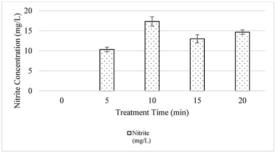 Concentration of nitrites (NO2−) produced in PAW under different treatment times (n = 3).