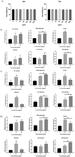 - Kang, N.J.; Koo, D.H.; Kang, G.J.; Han, S.C.; Lee, B.W.; Koh, Y.S.; Hyun, J.W.; Lee, N.H.; Ko, M.H.; Kang, H.K.; et al. Dieckol, a Component of Ecklonia cava, Suppresses the Production of MDC/CCL22 via Down-Regulating STAT1 Pathway in Interferon-gamma Stimulated HaCaT Human Keratinocytes. Biomol. Ther. 2015, 23, 238–244. [Google Scholar] [CrossRef] [PubMed]